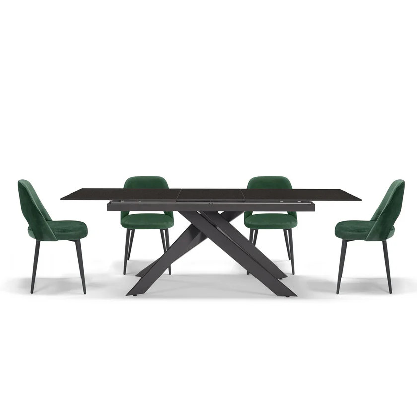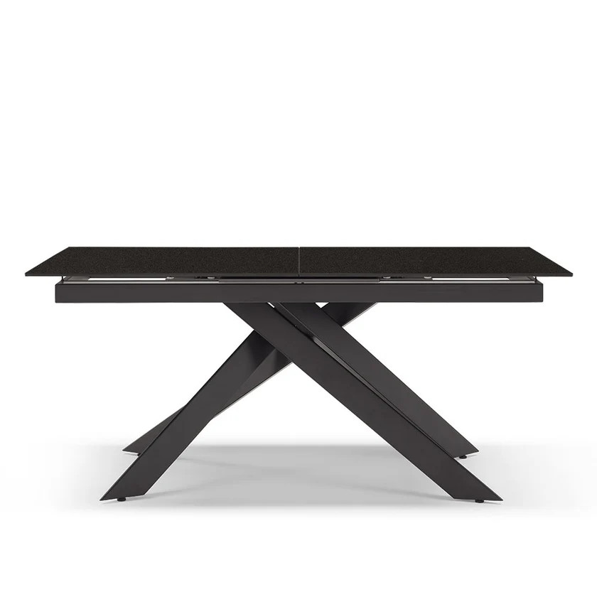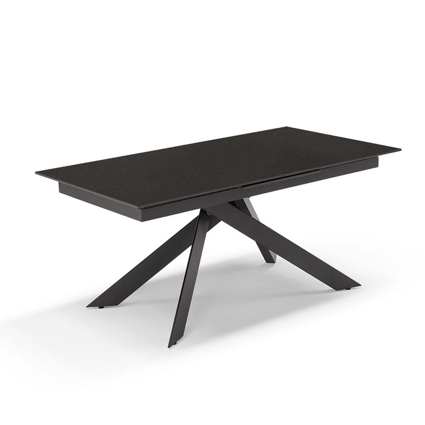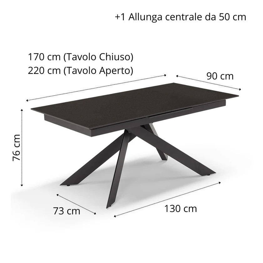Dimensioni: L 170 x P 90 x H 76 (+1 allunga da 50 CM) Tavolo allungabile con basamento centrale e meccanismo di apertura completamente automatico, piano ceramico impermeabile e resistente ai graffi e gambe ad incrocio. Allungabile centralmente fino a 220 cm