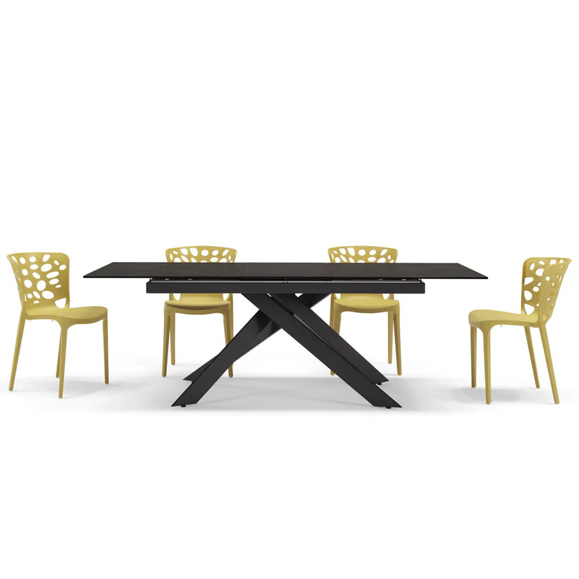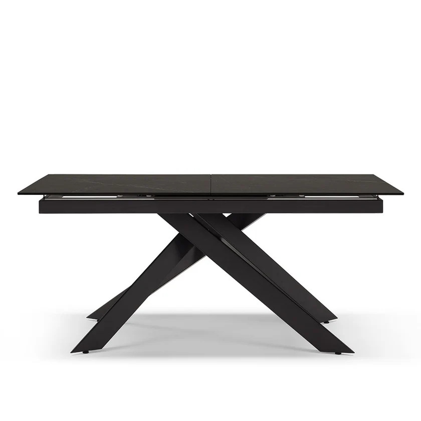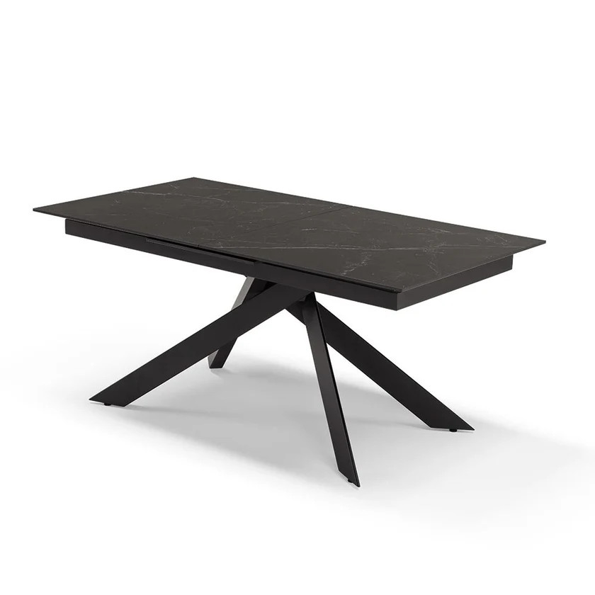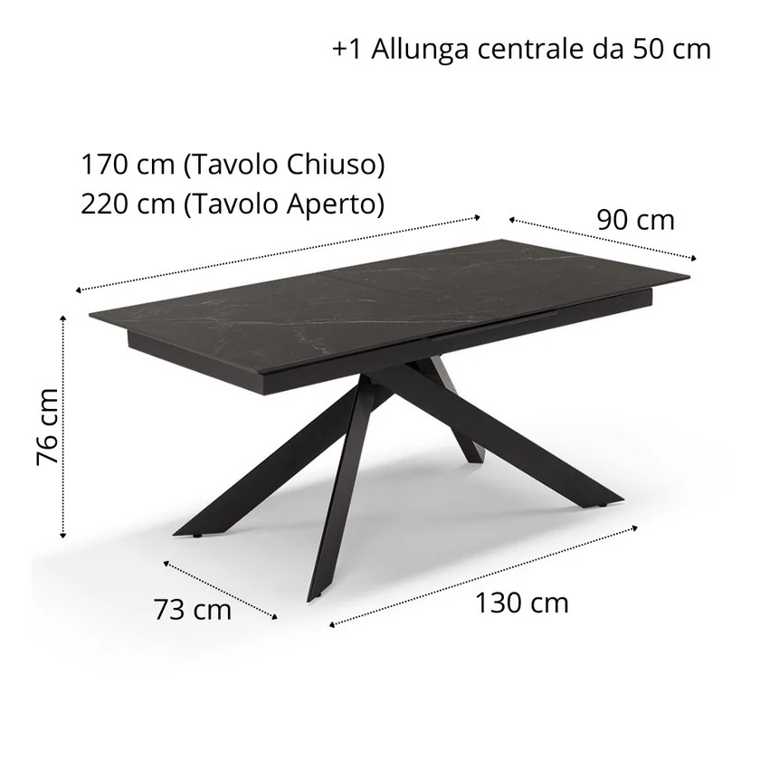 Dimensioni: L 170 x P 90 x H 76 (+1 allunga da 50 CM) Tavolo allungabile con basamento centrale e meccanismo di apertura completamente automatico, piano ceramico impermeabile e resistente ai graffi e gambe ad incrocio. Allungabile centralmente fino a 220 cm