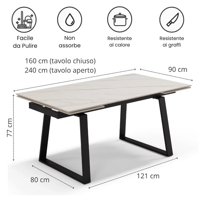 Dimensioni: L 160 x P 90 x H 76 (+2 allunghe da 40 CM) Allungabile lateralmente fino a 240 cm.