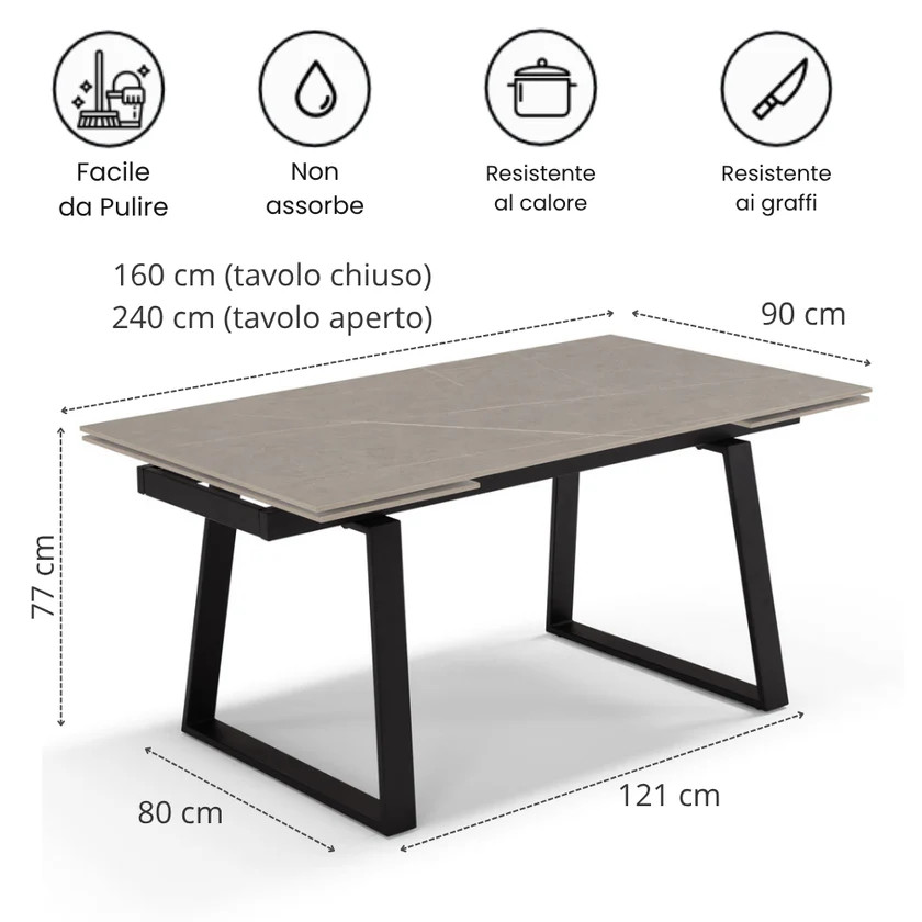 Dimensioni: L 160 x P 90 x H 76 (+2 allunghe da 40 CM) Allungabile lateralmente fino a 240 cm.