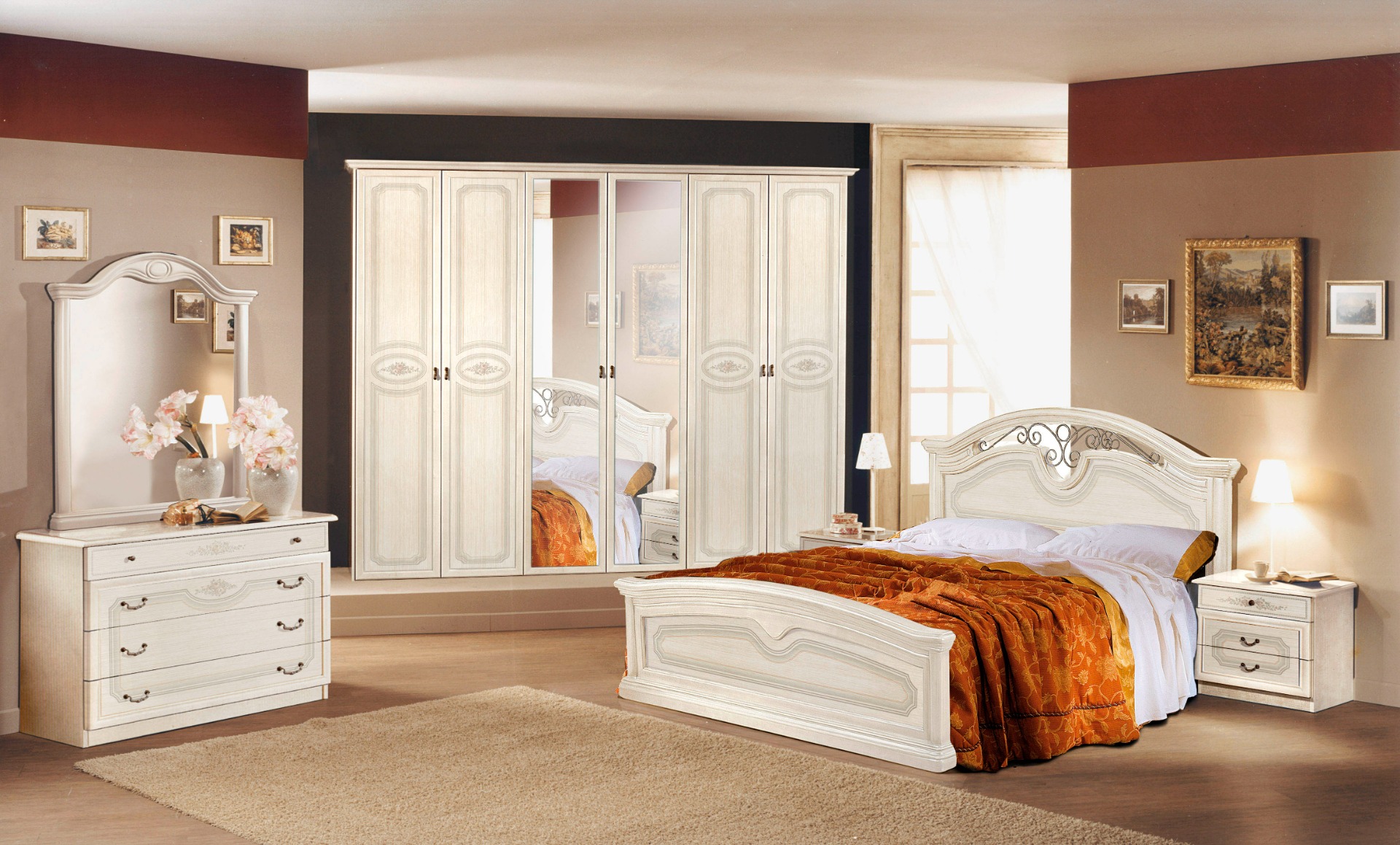 Camera matrimoniale LIVIA come foto nella finitura patinato beige con decori completa di armadio a 6 ante battente con specchi, letto in legno e gruppo camera completa di comò e 2 comodini.