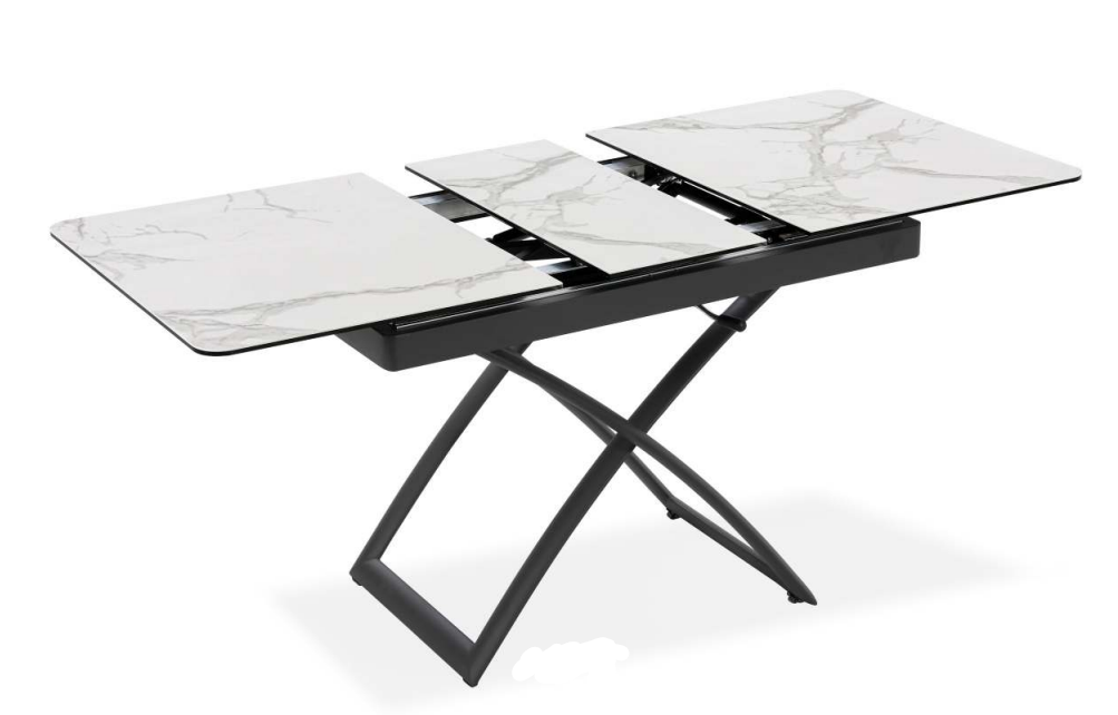 Tavolo ceramica con top in vetro temperato sp. 11 mm (ceramica 3mm, vetro temperato 8mm), struttura in metallo fi nitura ghisa, con altezza variabile da 44,5 a 77,5 cm.