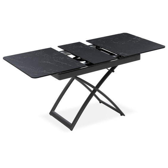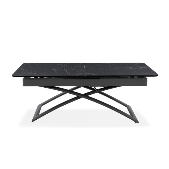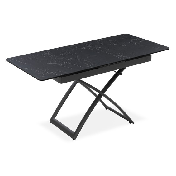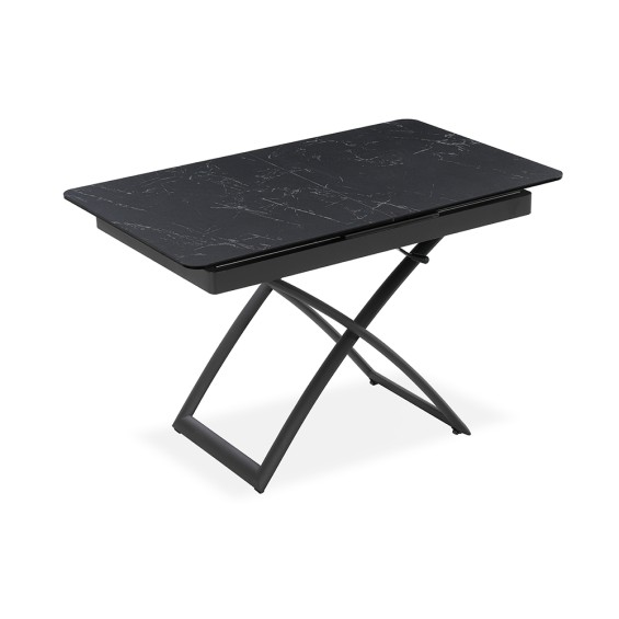 Tavolo ceramica con top in vetro temperato sp. 11 mm (ceramica 3mm, vetro temperato 8mm), struttura in metallo fi nitura ghisa, con altezza variabile da 44,5 a 77,5 cm.