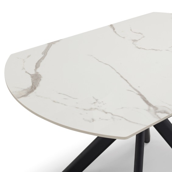 Tavolo ellittico con top in grès ceramico da 11 mm, resistente ai graffi con gambe in metallo effetto ghisa.