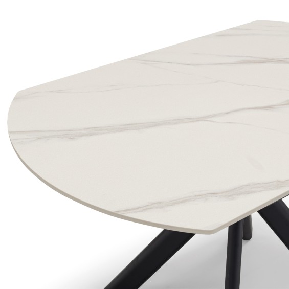 Tavolo ellittico con top in grès ceramico da 11 mm, resistente ai graffi con gambe in metallo effetto ghisa.
